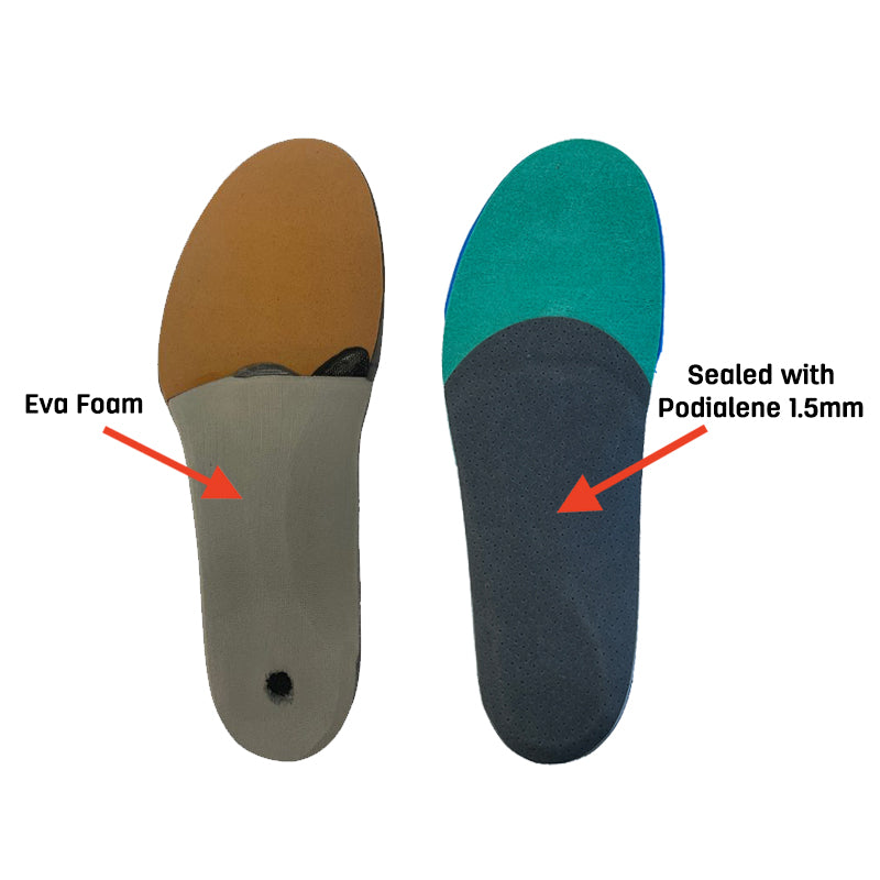 Soft EVA foam supports and stabilises the foot, often used on orthotics with a more dynamic function, such as running. Sealed with Podialene 1.5mm cover.